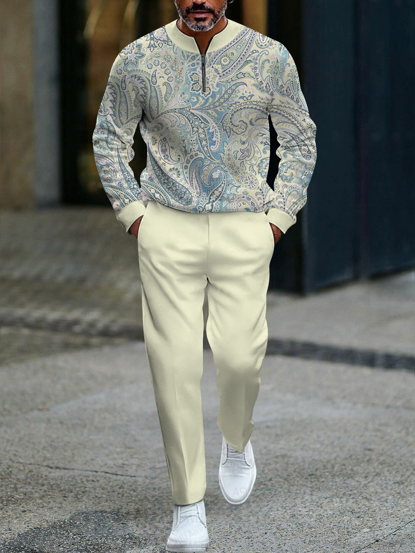 European and American spring and autumn new Men’s fashion retro style geometric art graffiti pattern print, stand collar long sleeve shirt and casual pants sportswear, suitable for outdoor daily casual suits