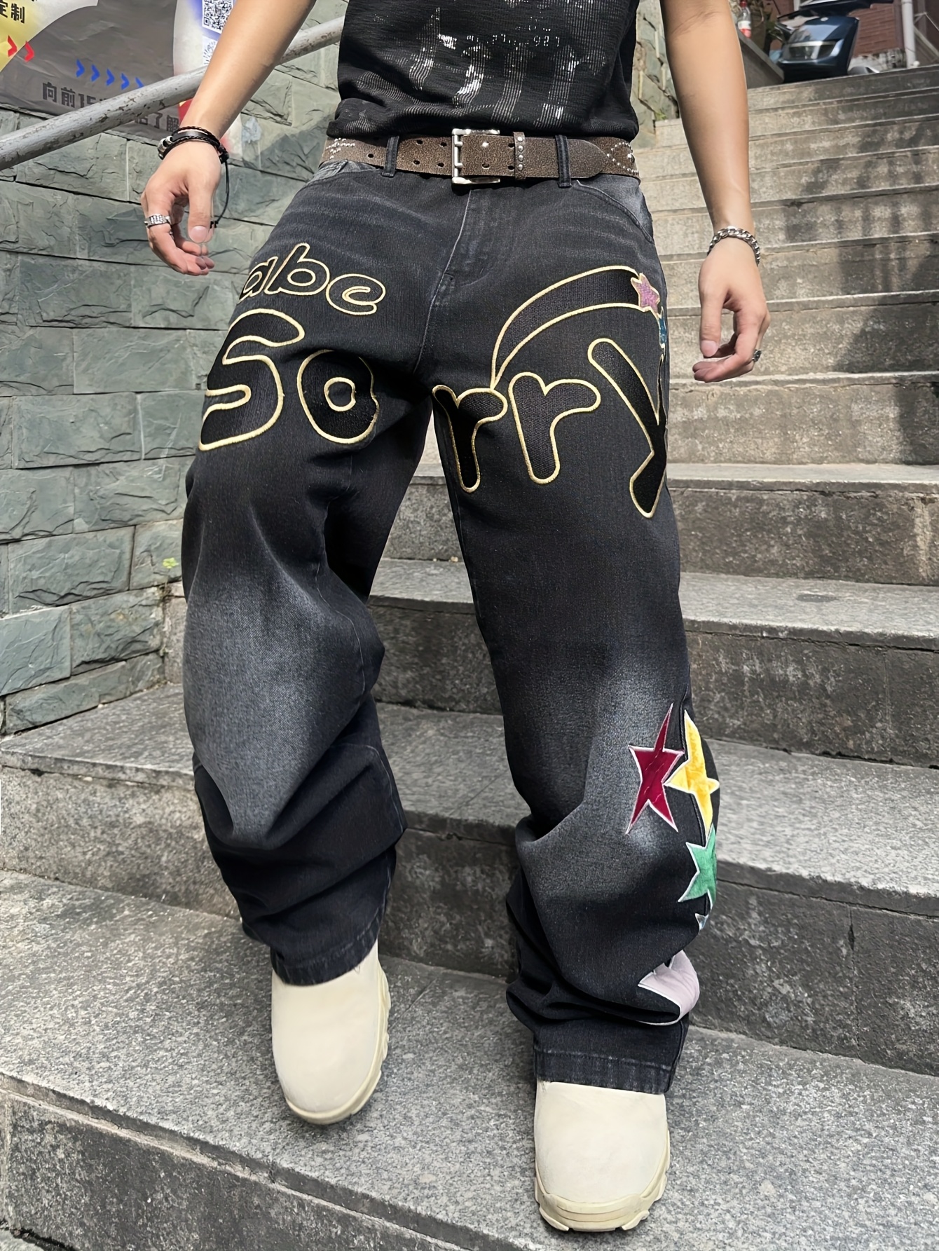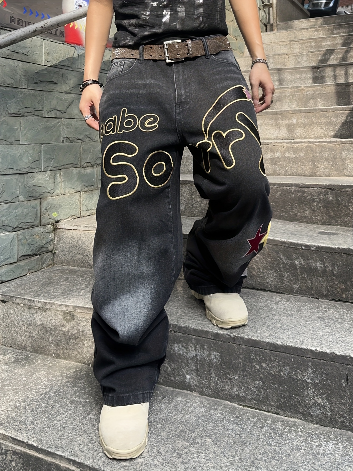 Men’s American-style Trendy Loose Jeans, Letter Embroidered Design High Street Jeans (without Beltu002Fwithout Hanging Decoration)