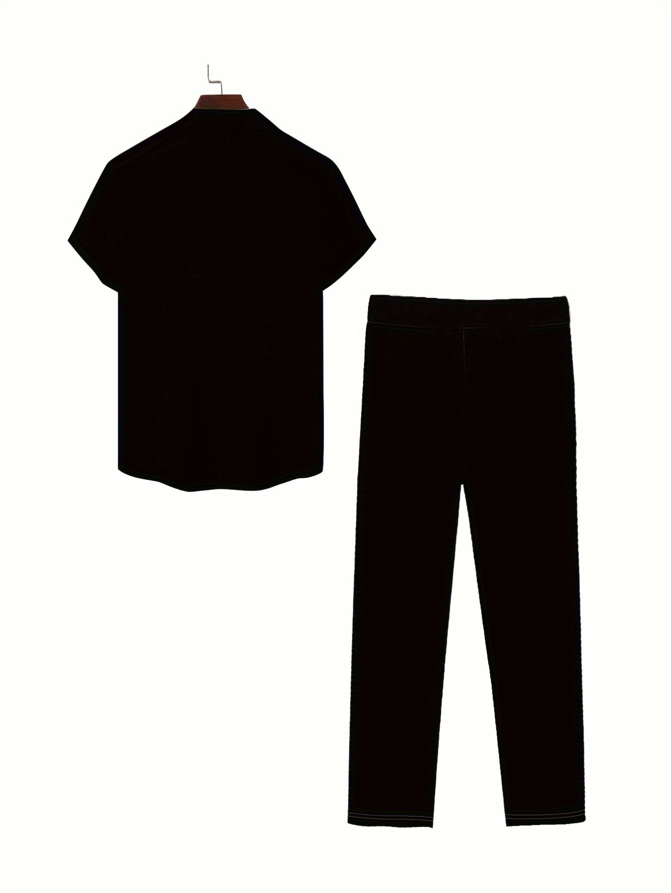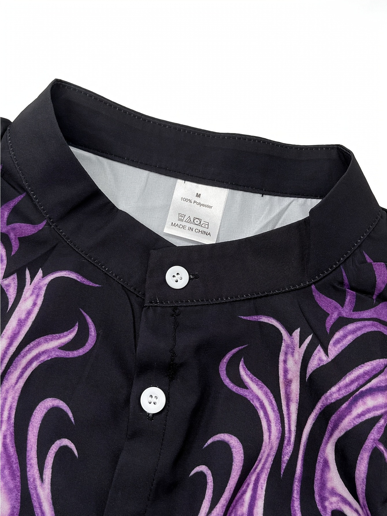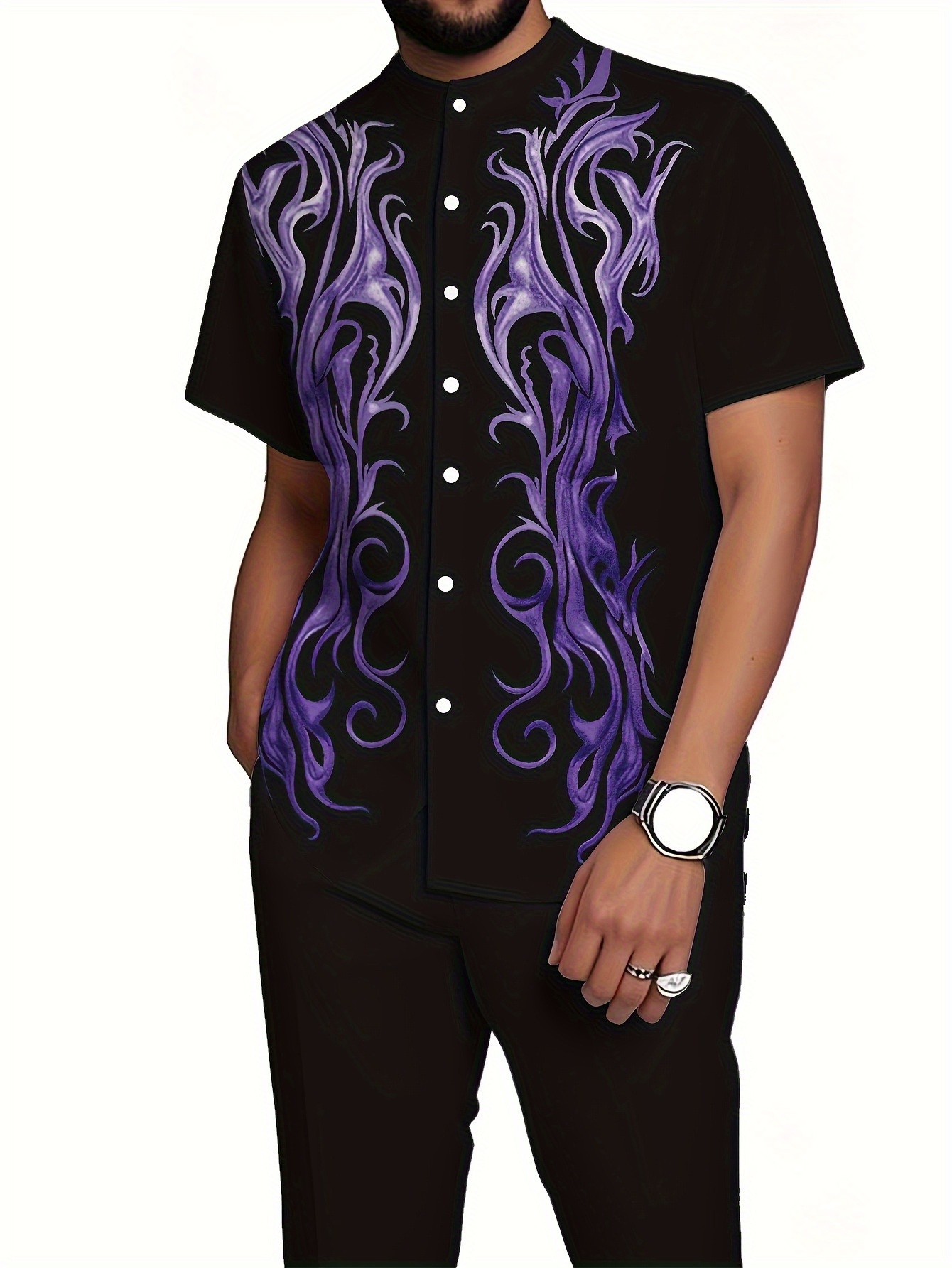Men’s formal casual stand up collar shirt set | Black with purple tribal flame print, short sleeved, button open, slim fit pants | Trendy and suitable for parties and various occasions