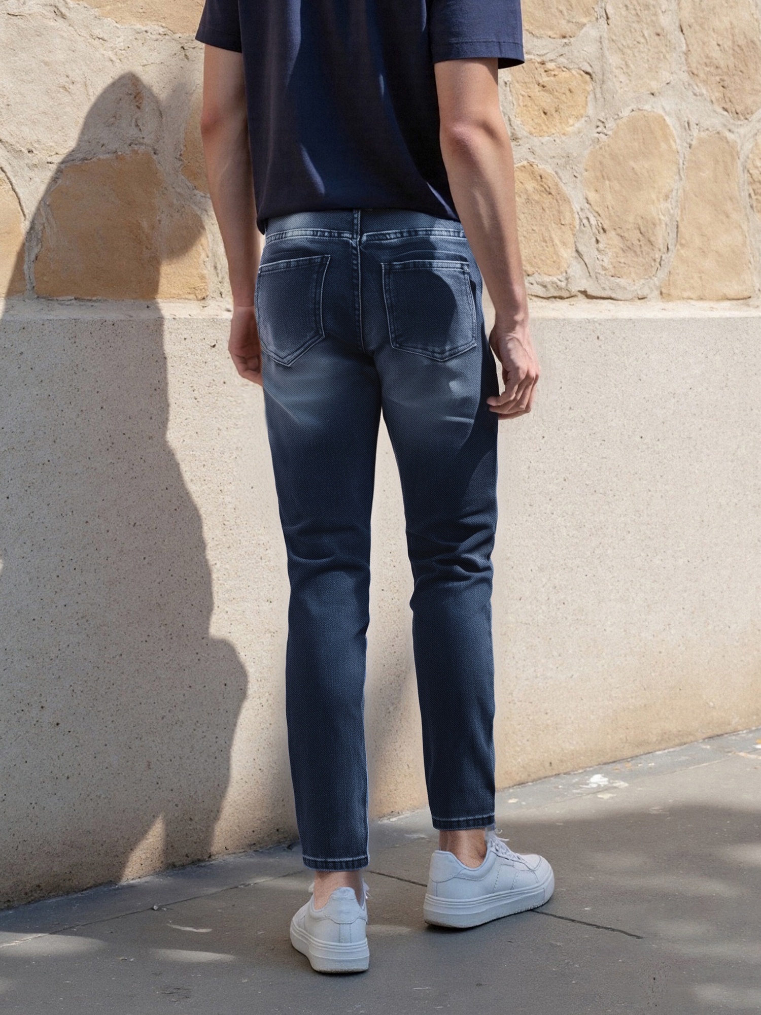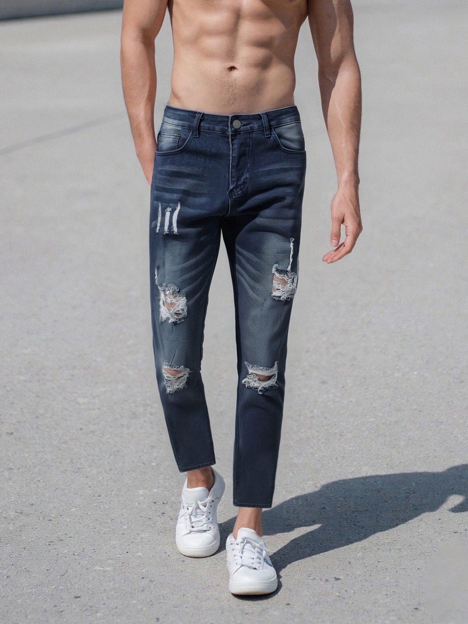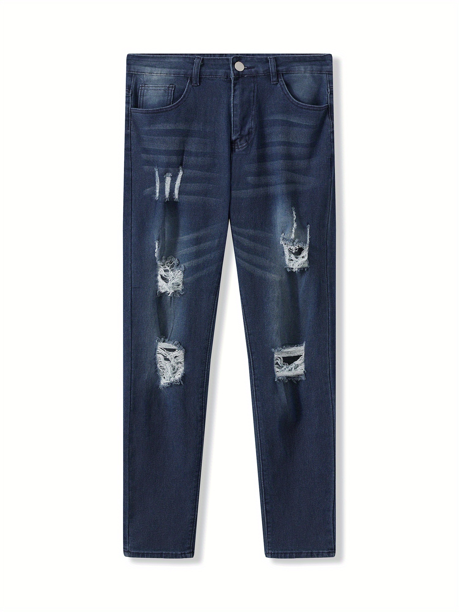 Men’s Skinny High-Waisted Stretch Denim Jeans – Lightweight Ripped Distressed Blue Washed Pants with White Torn Details, All-Season Casual Streetwear Trousers for Men, Machine Washable Slim Fit Jeans