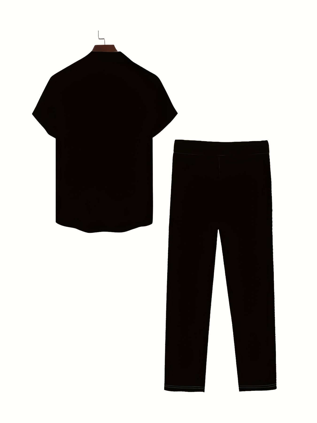 Men’s Slim Fit Short Sleeve Shirt And Pants Suits, Polyester Fiber Woven Flame Stamp And Button, Henry Collar Sets, Solid Color Elastic Drawstring Waist And Pockets Men’s Casual Tracksuits, for Events And Dates