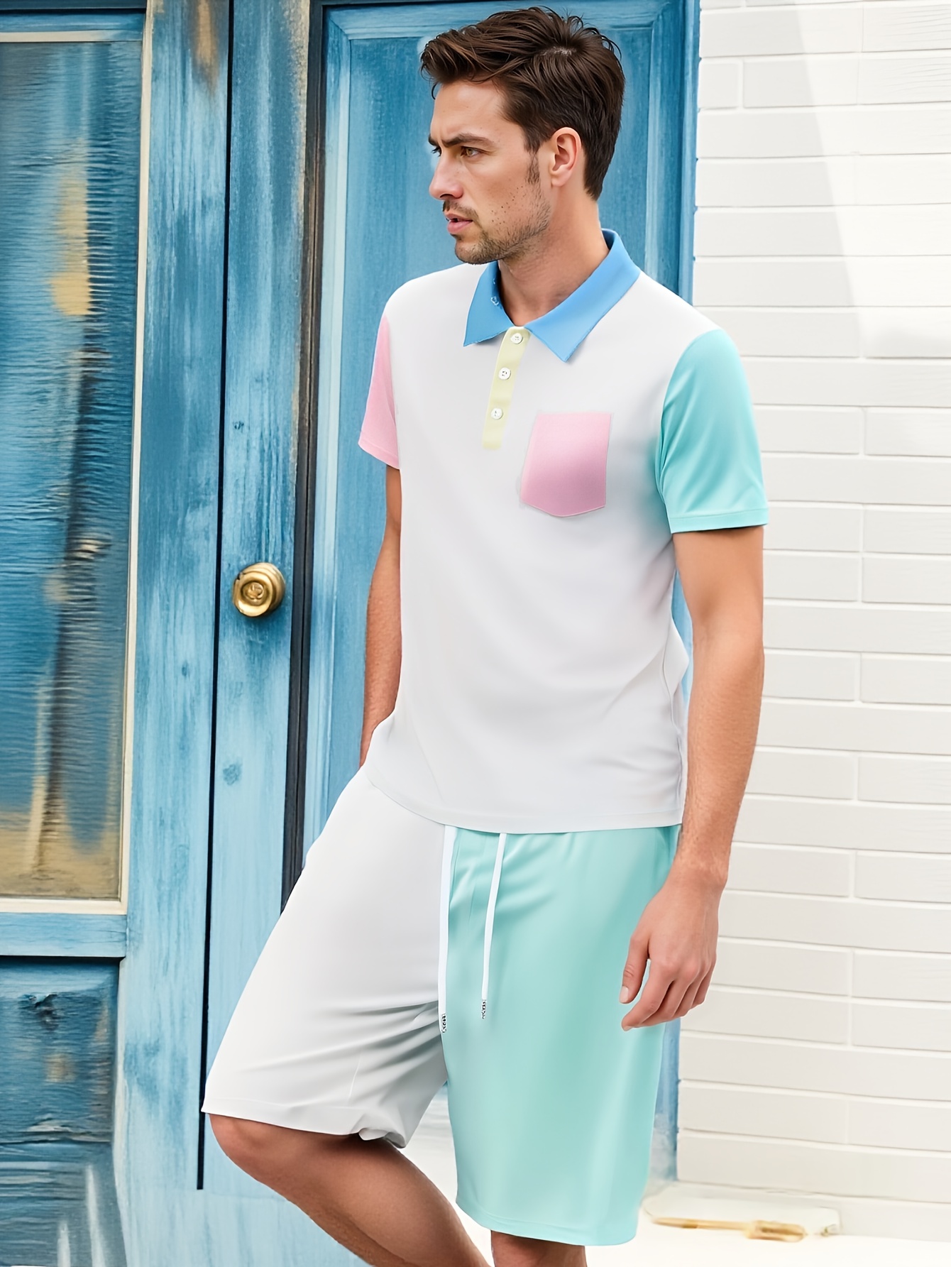 Men’S Stylish Short Sleeve Polo Shirt And Sweatsuits, Fashion And Color Block Stripes Stamp, Quarter Zipper Collar Lapel Polo Shirt Men’S Suits, Elastic Drawstring Adjustable Waist And Side Pockets Summer Casual Sets, for Sport And Party