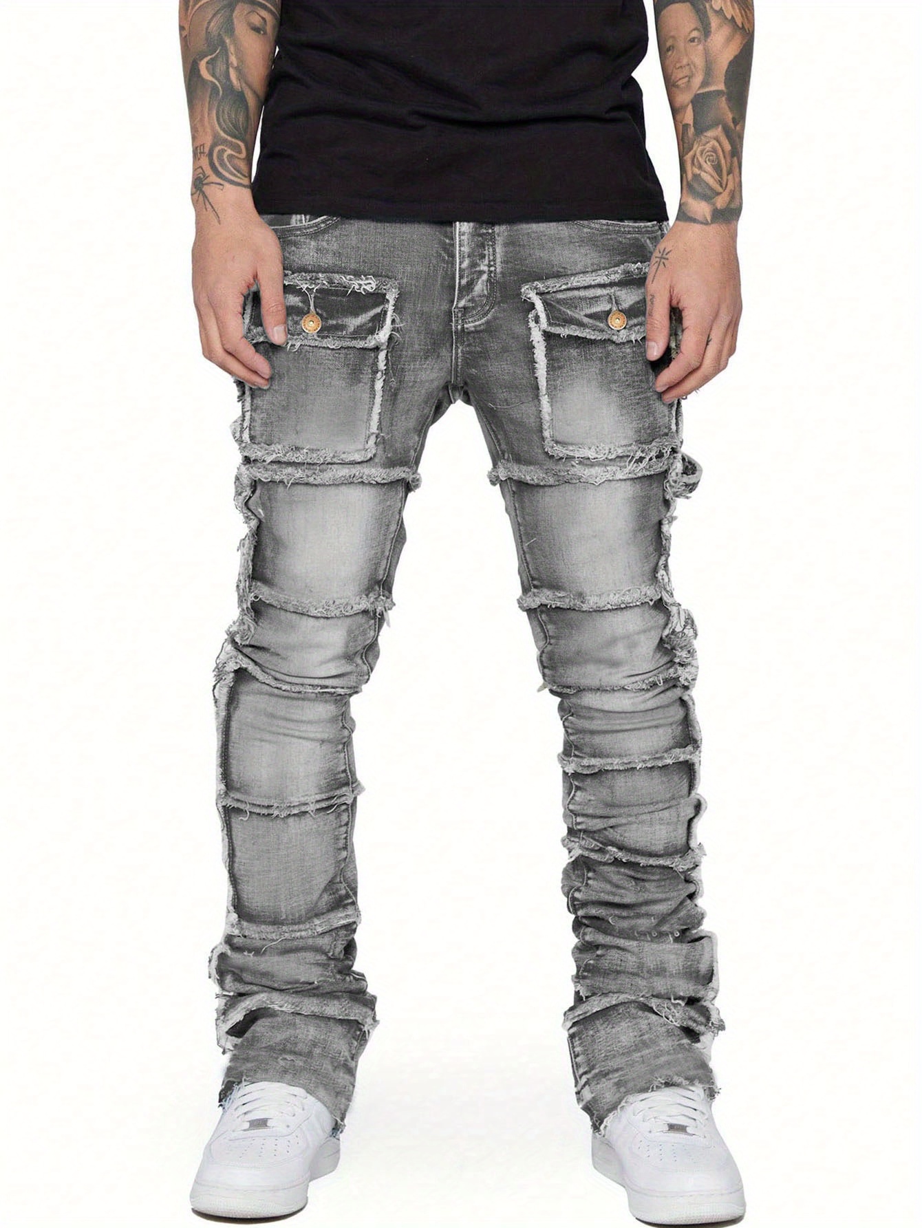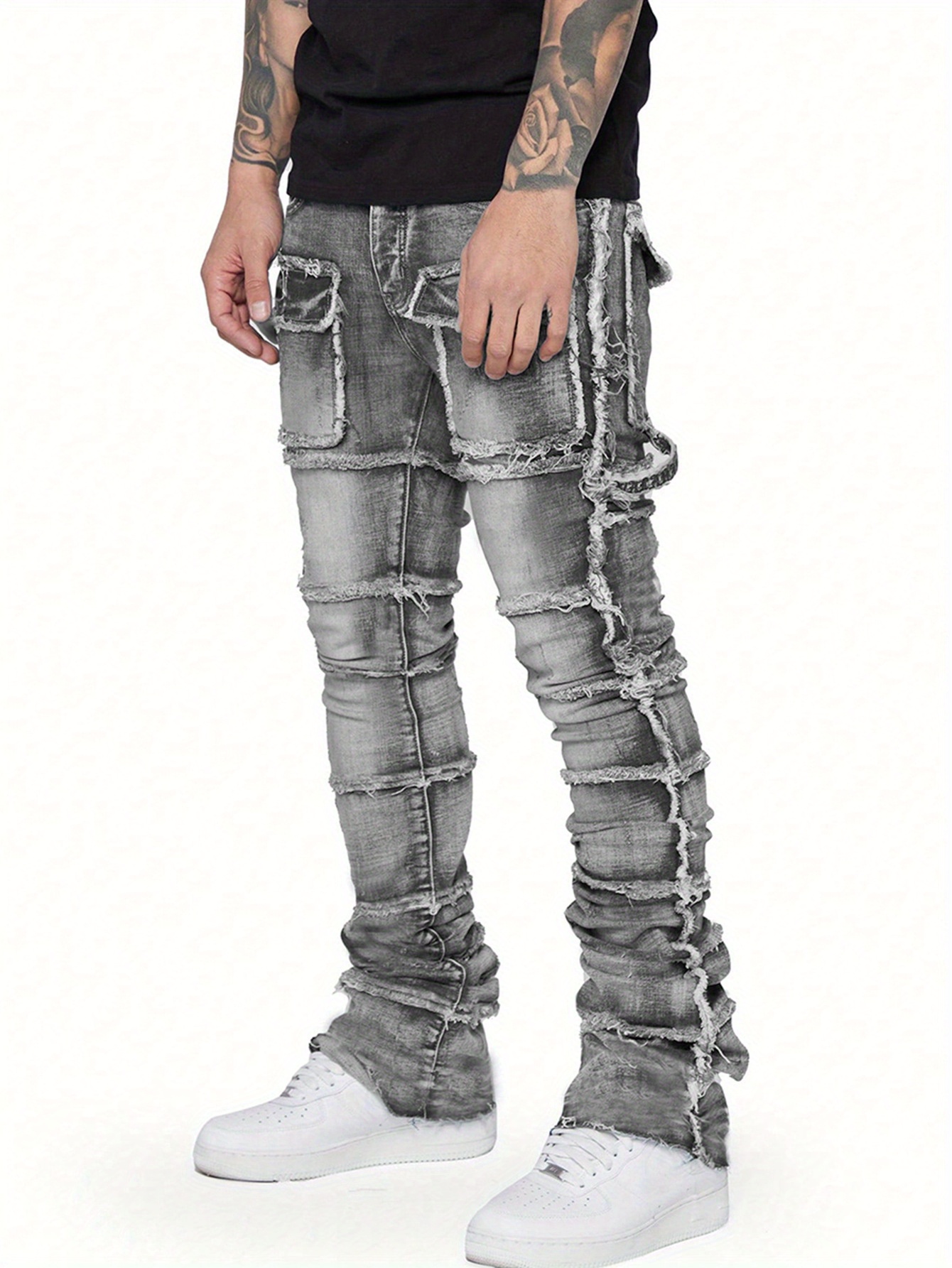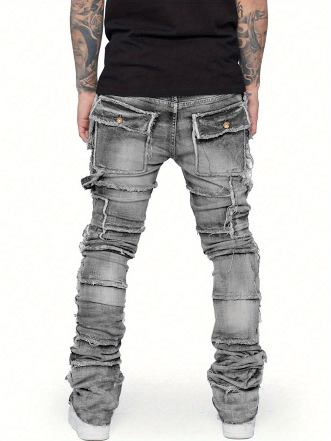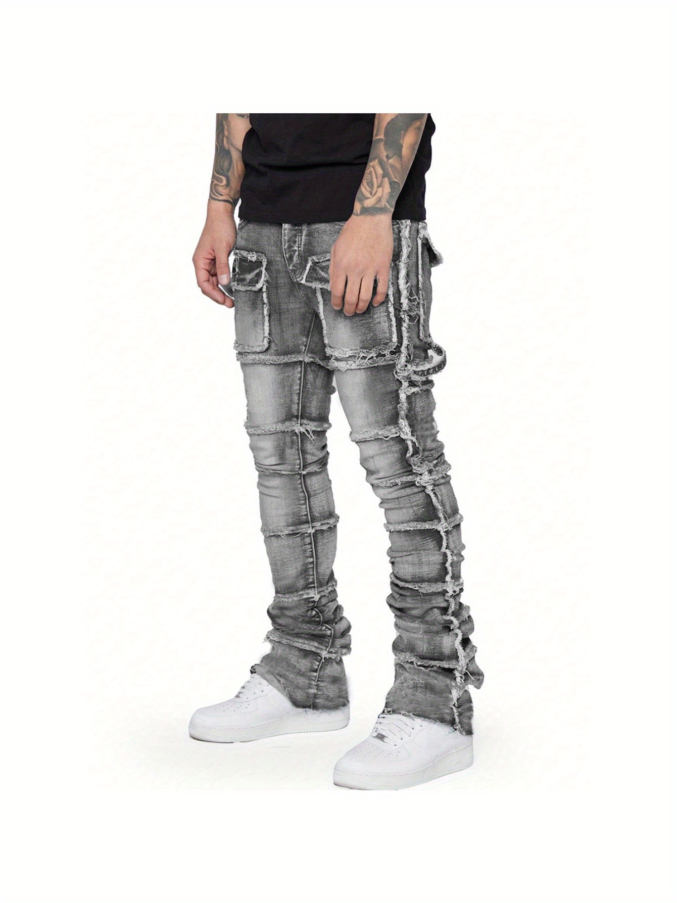 Men’s Workwear-Style Grey Denim Straight-Leg Pants with Hand-Stitched Frayed Edges & Elasticated Large Pocket – Slim-Fit Streetwear Jeans with Layered Leg Cuffs, All-Season Comfort for Casual & Work Outfits (Hand Washable)