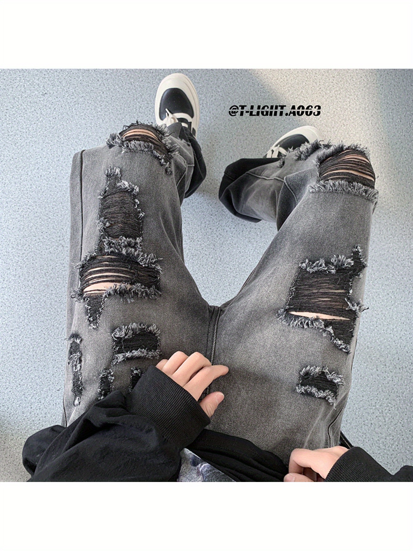 Stylish Gradient Black And Gray Ripped Jeans for Men, Inspired by High Street American Hip Hop, Featuring a Cool High-End Straight-Leg Design Suitable for a Trendy Look