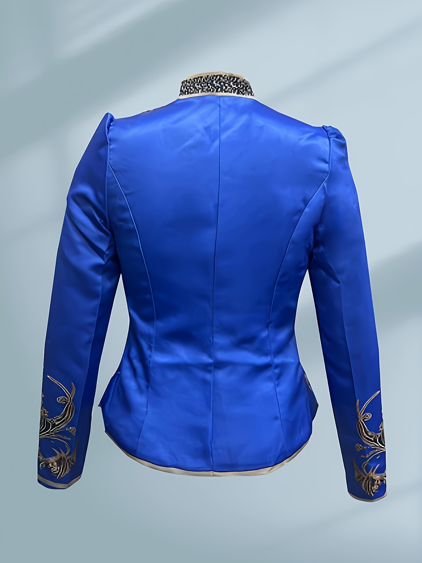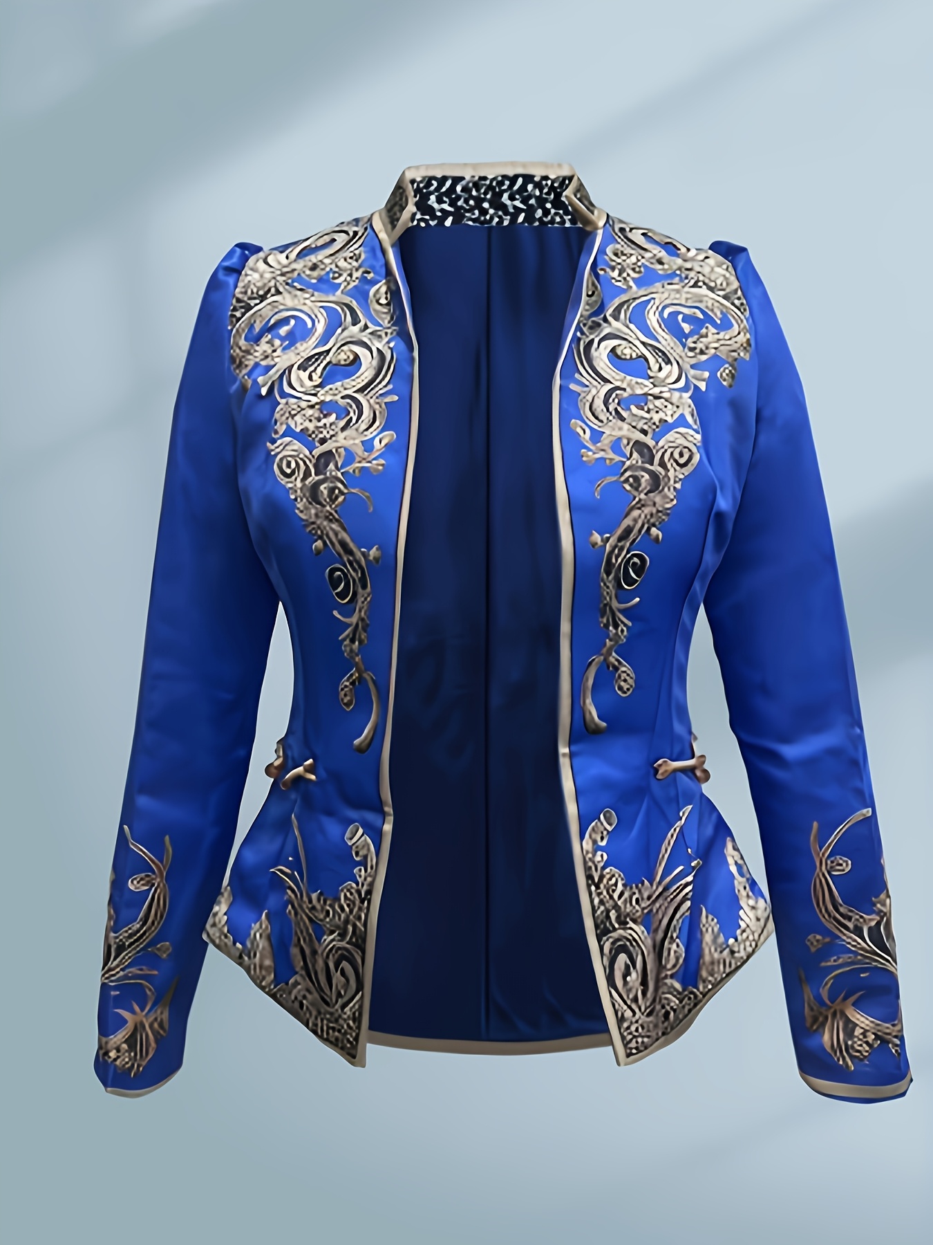 Vintage Floral Stand Collar Long Sleeve Jacket – Blue & Golden Floral Print, 100% Polyester, Machine Washable, Springu002FFall Lightweight Jacket for Casual & Formal Wear