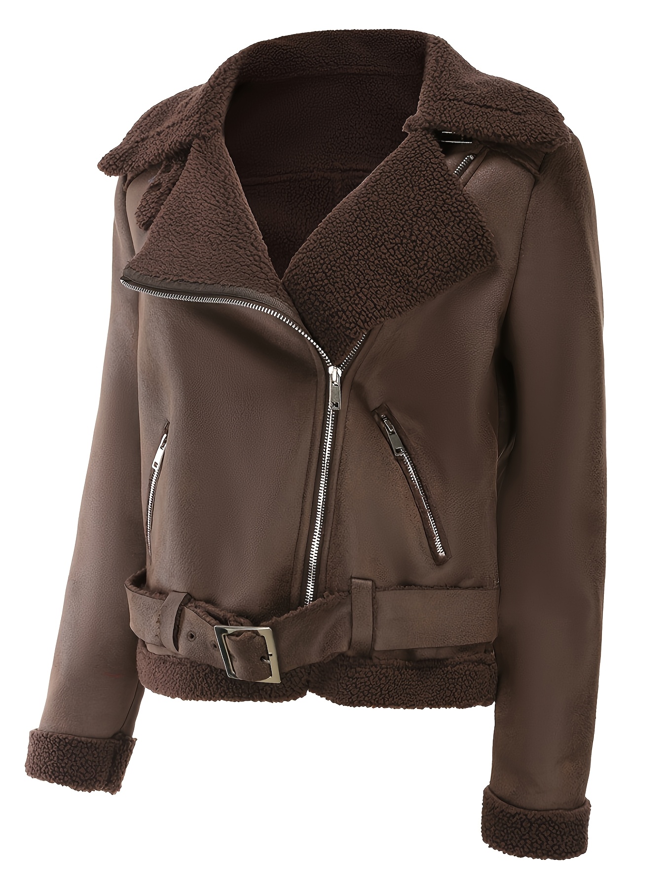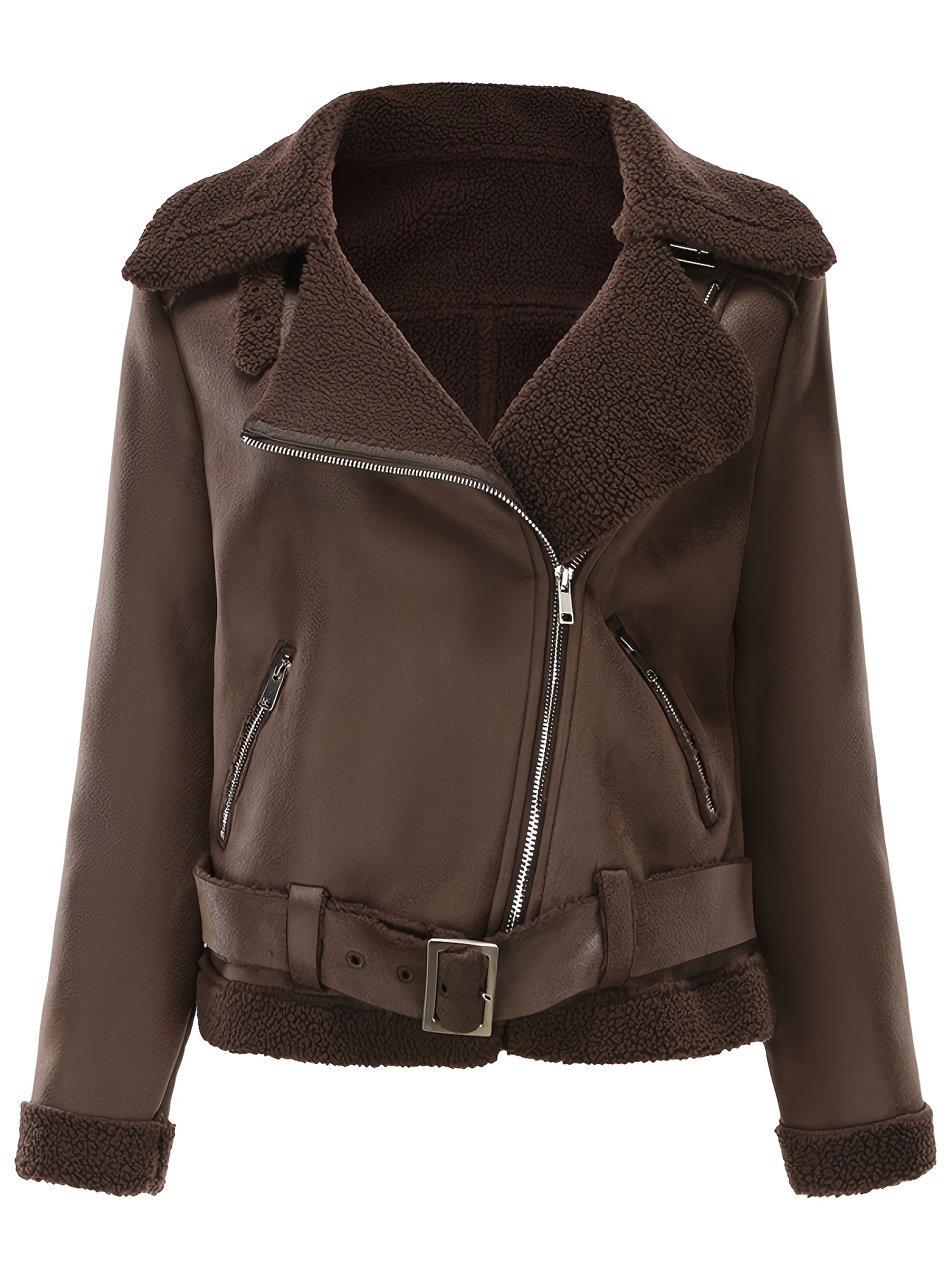 Women’s Autumn Winter Warm Suede Jacket with Belt & Lapel Collar – Casual Long Sleeve Button Front Zipper Closure, Machine Washable Solid Color Regular Fit for Everyday Casual Wear