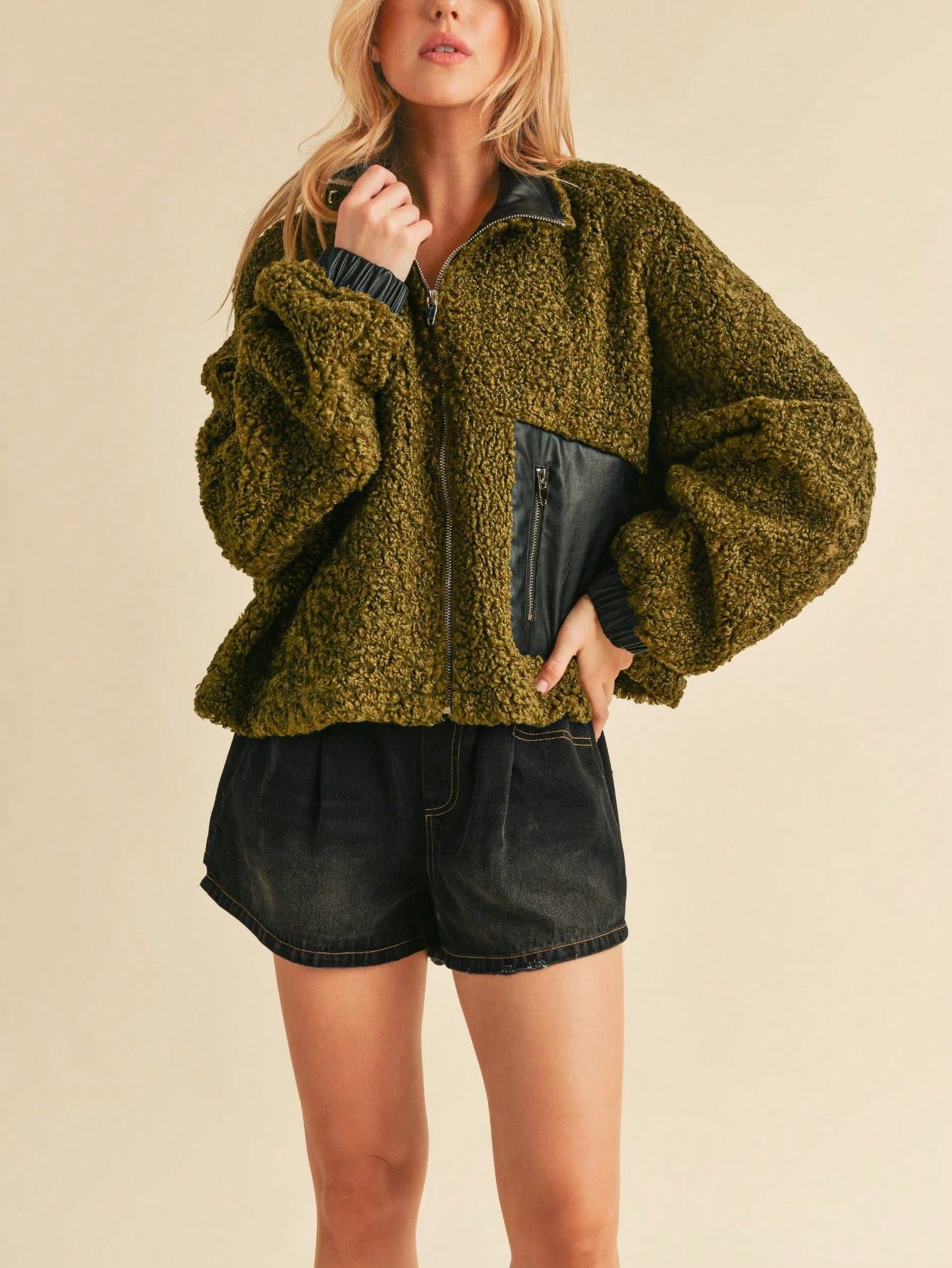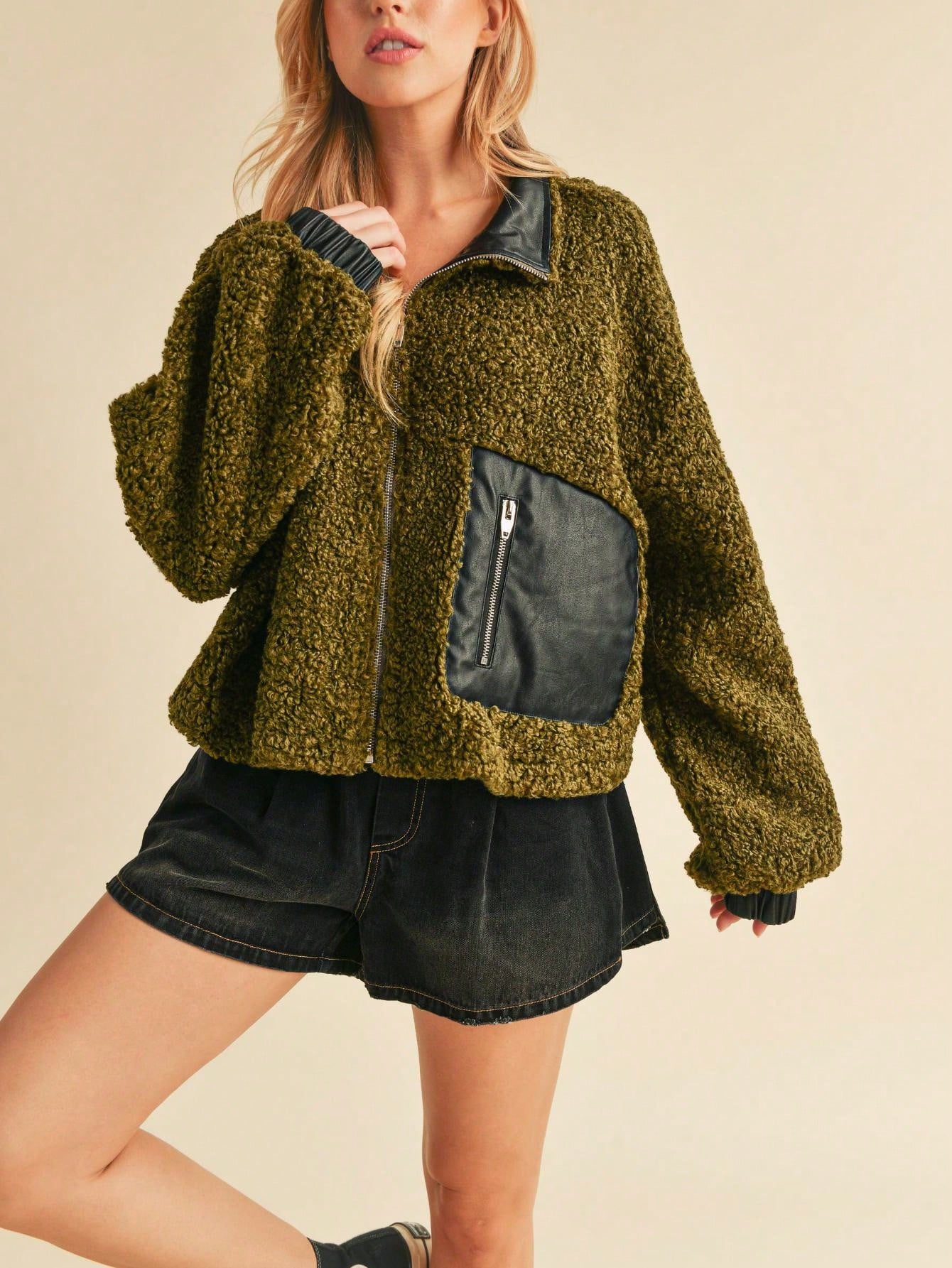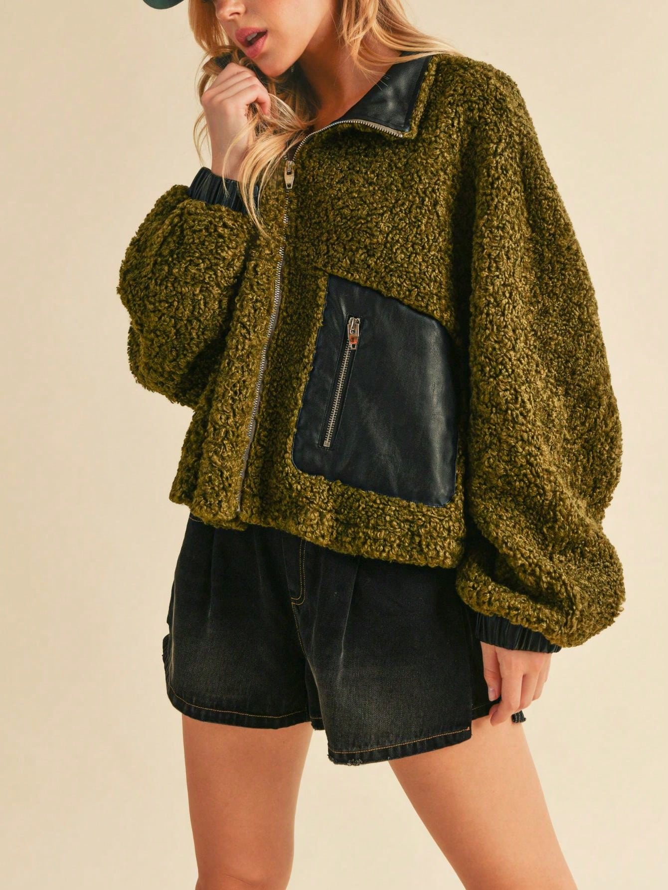 Womens Casual Teddy Bear Chic Leather Trim Zipper Pocket Sherpa Jacket Olive Green Long Sleeve Cropped Length Stand Collar Plush Textured Fall Winter Street Style Outerwear