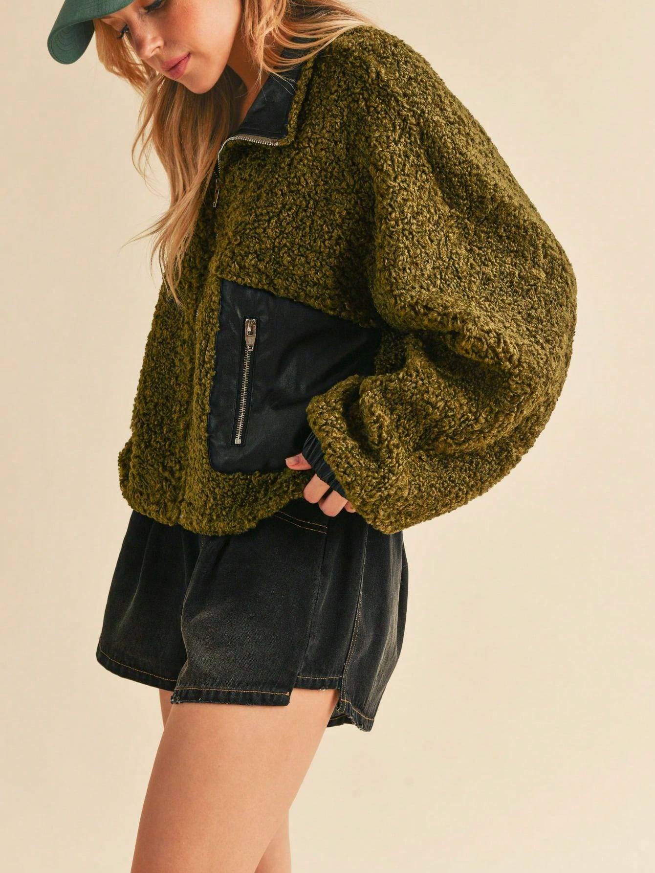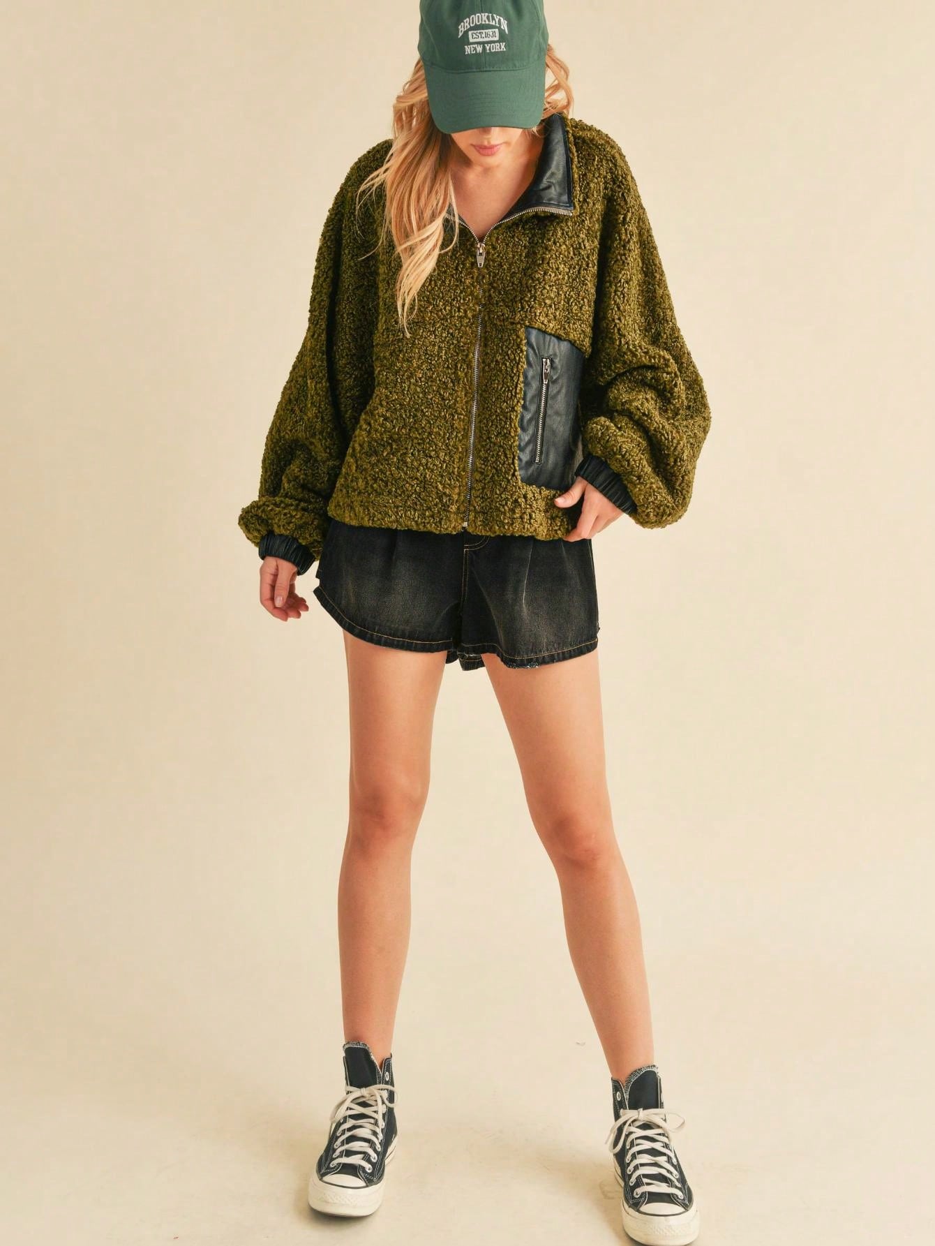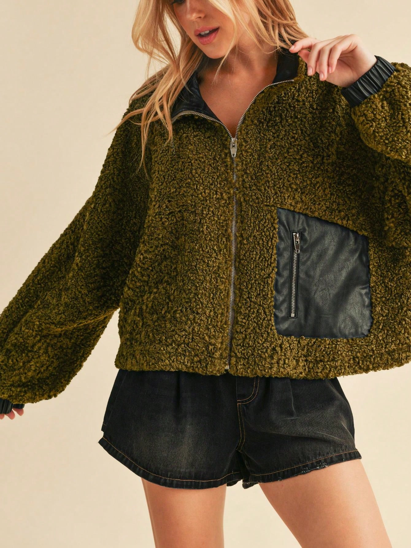 Womens Casual Teddy Bear Chic Leather Trim Zipper Pocket Sherpa Jacket Olive Green Long Sleeve Cropped Length Stand Collar Plush Textured Fall Winter Street Style Outerwear