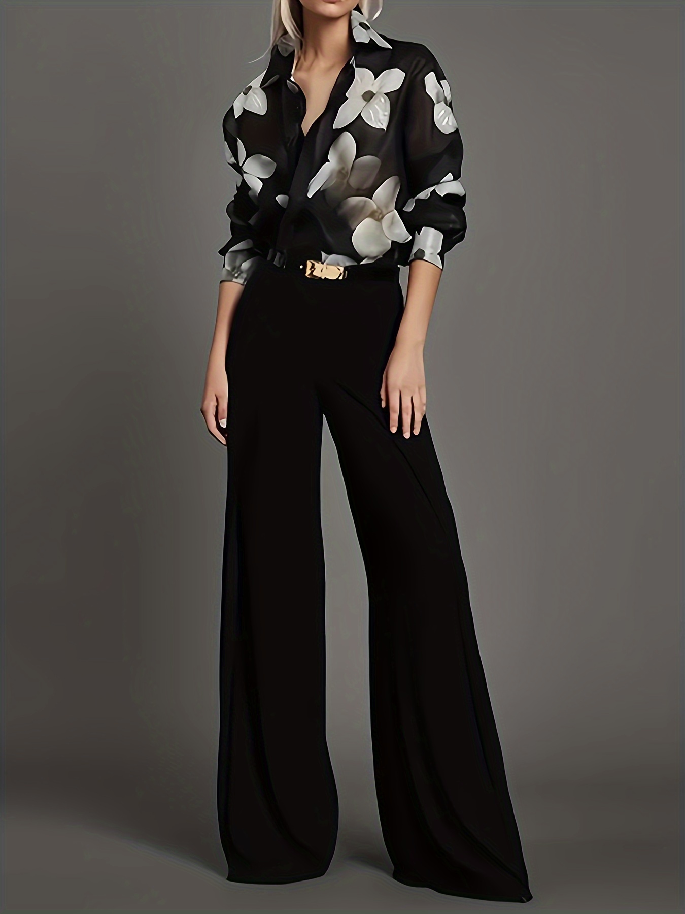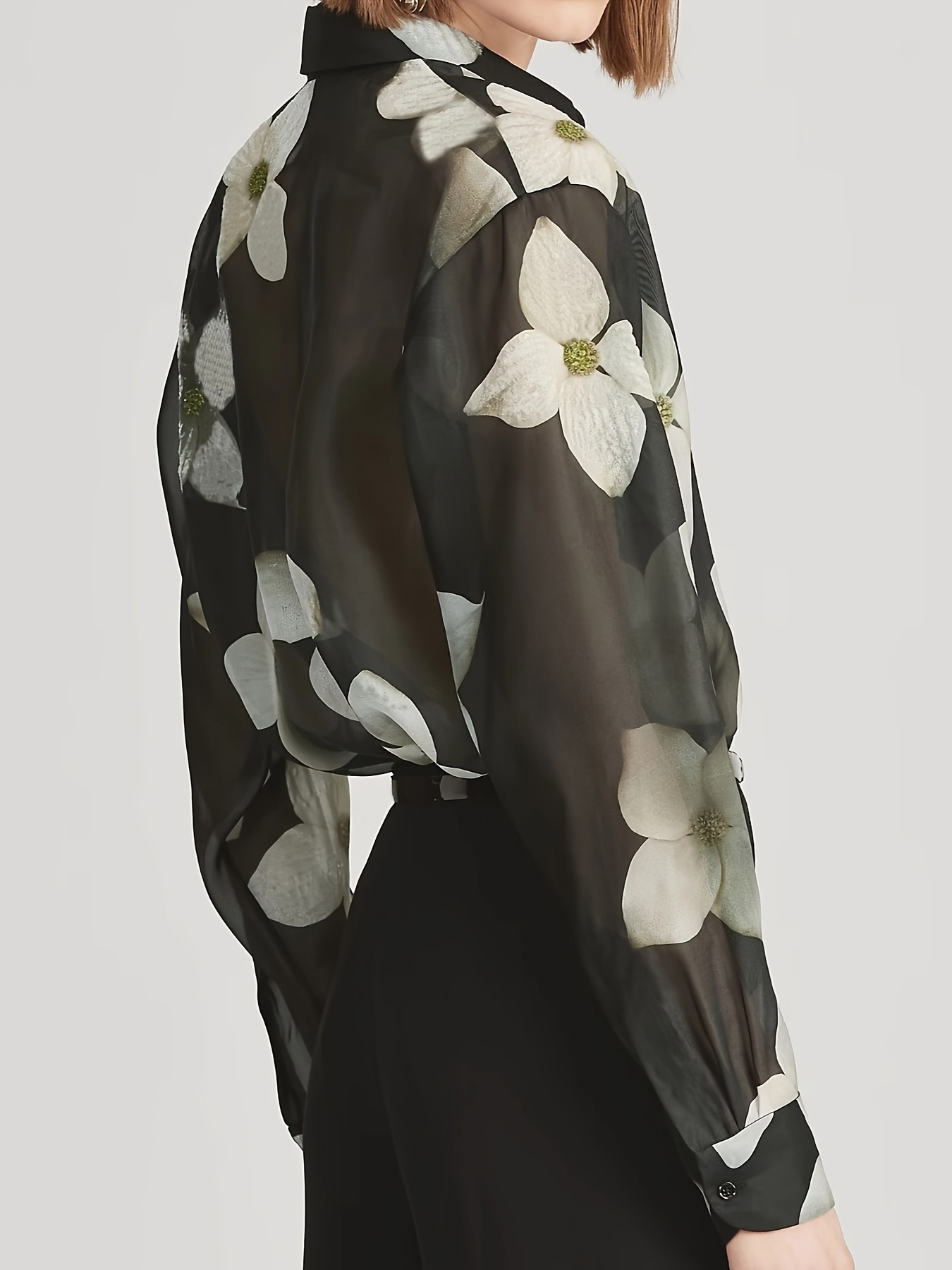 Women’S Elegant Satin Floral Print Blouse – Chic Long Sleeve Button-Up Shirt with Black & White Floral Design, Comfortable Collar, Perfect for Springu002FSummeru002FFall, Casual to Formal Wear, Floral Print Blouse