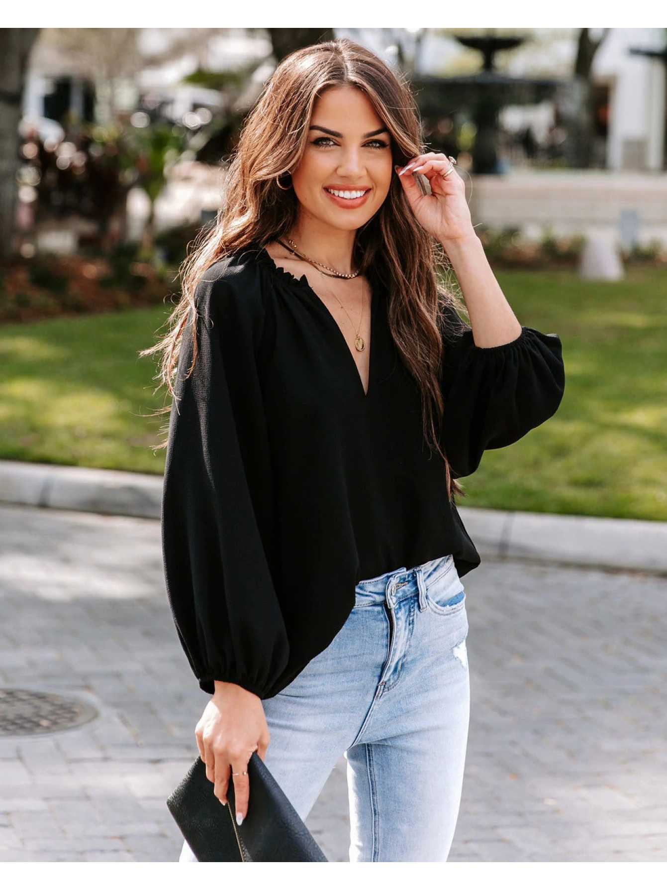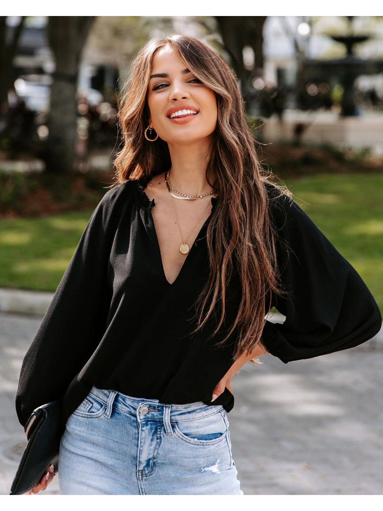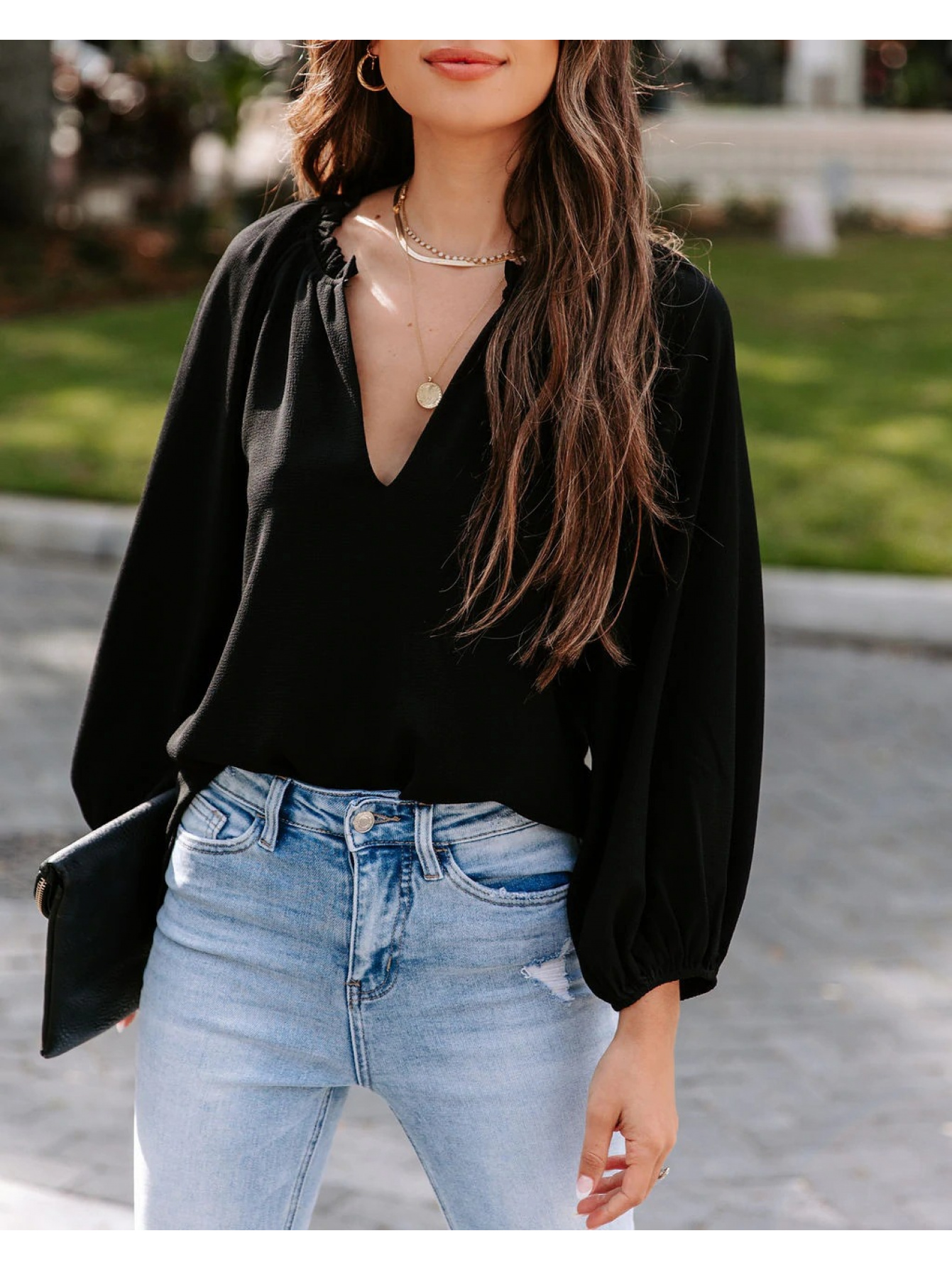 Women’s Elegant V-Neck Long Sleeve Shirt – Solid Black Loose Fit Casual to Semi-Formal Top, Lightweight Breathable Non-Stretch Fabric for Spring Summer Fall, Versatile Everyday & Special Occasion Blouse