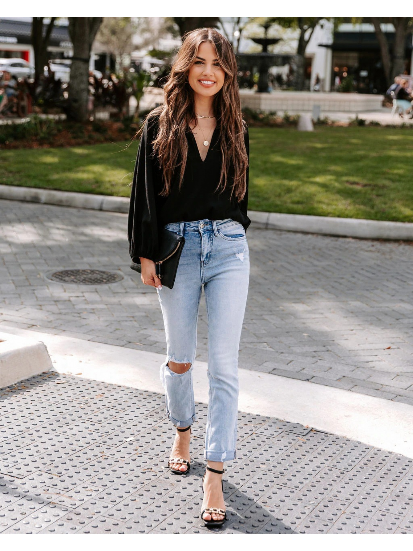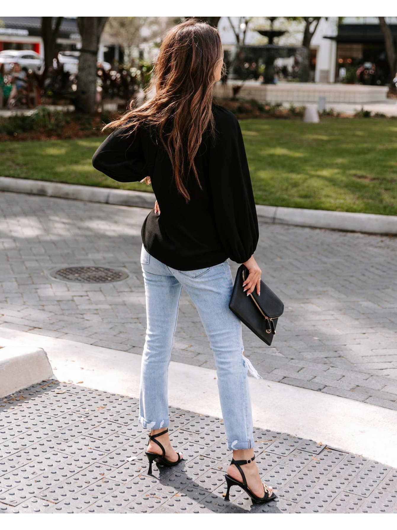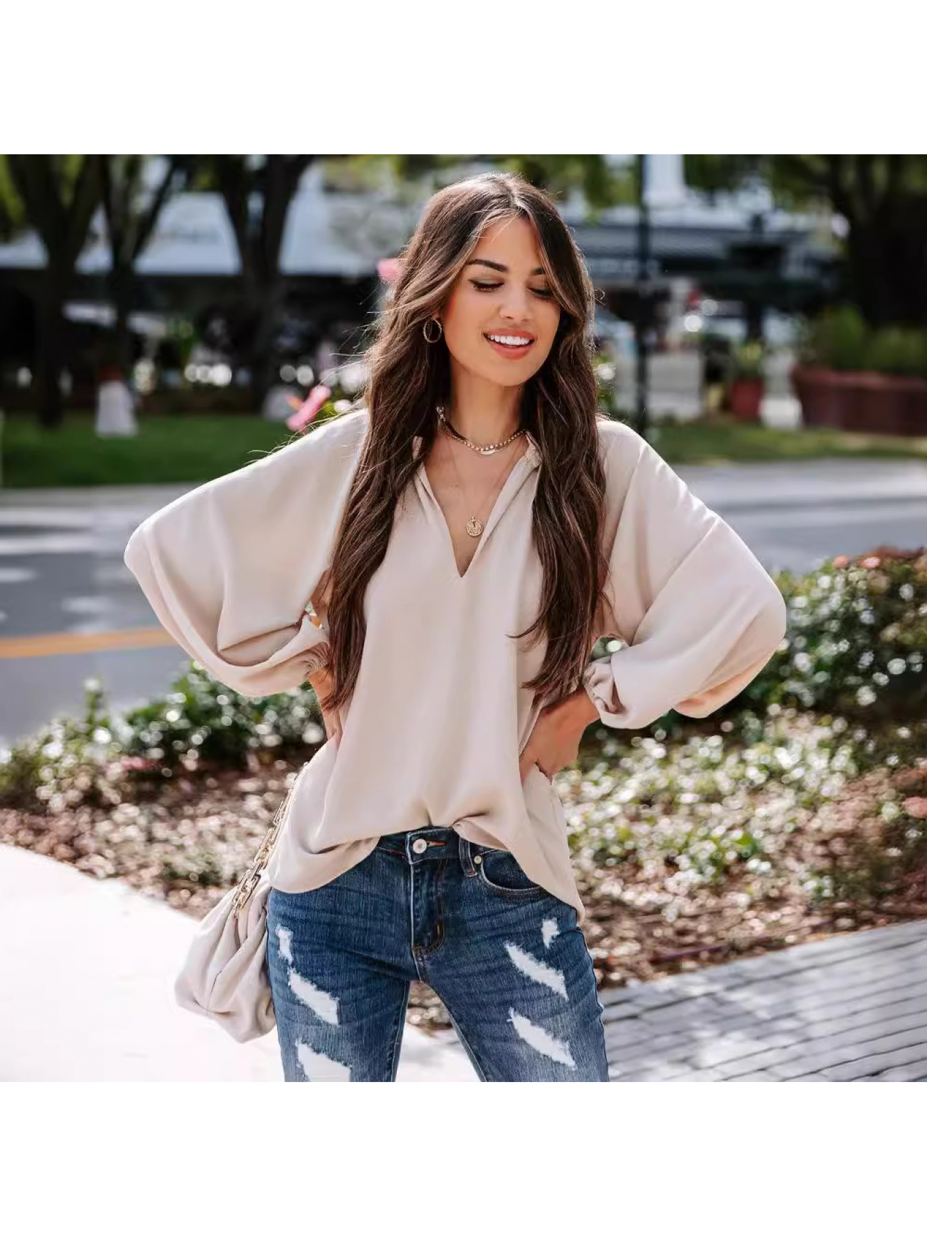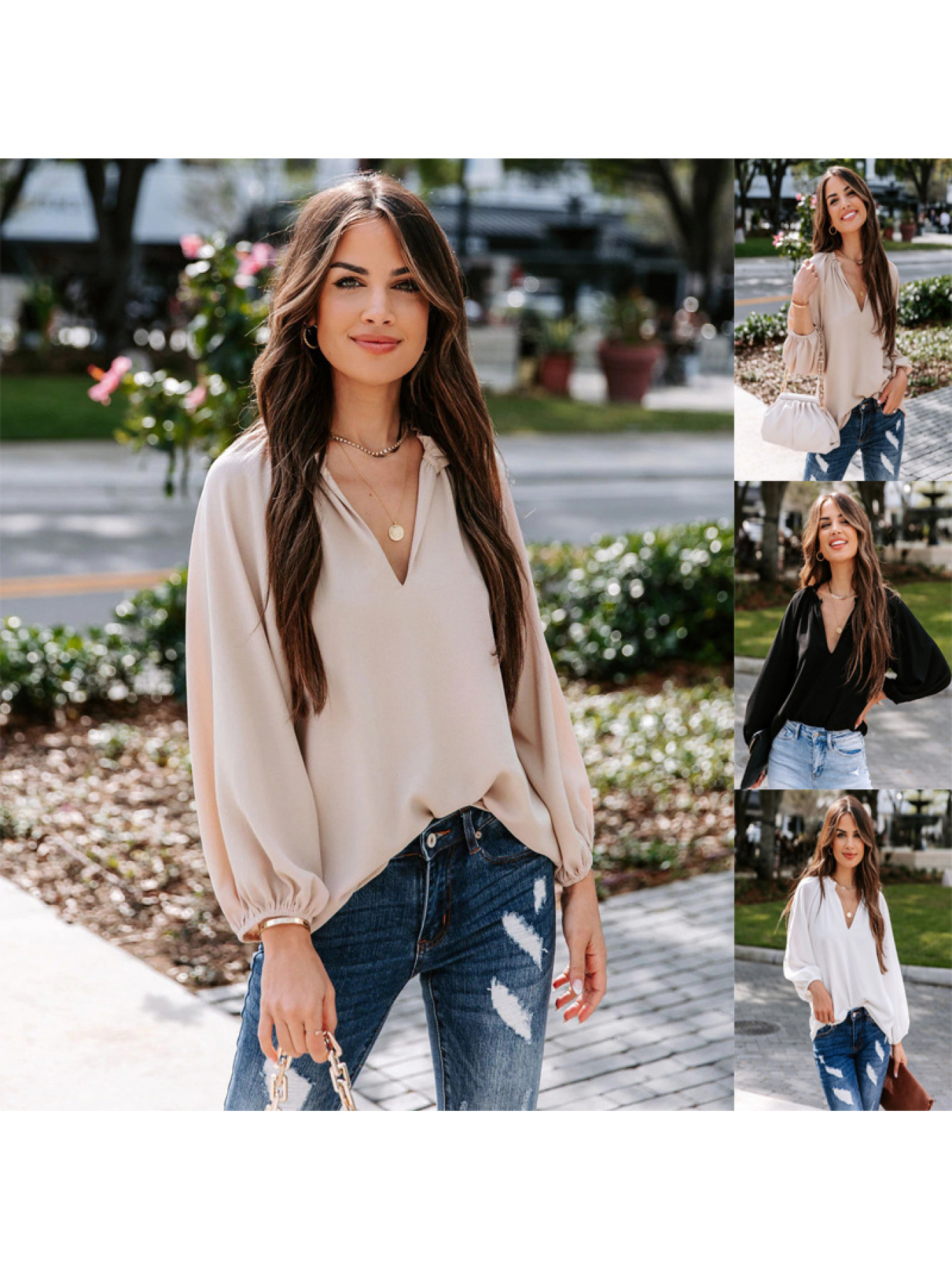 Women’s Elegant V-Neck Long Sleeve Shirt – Solid Black Loose Fit Casual to Semi-Formal Top, Lightweight Breathable Non-Stretch Fabric for Spring Summer Fall, Versatile Everyday & Special Occasion Blouse