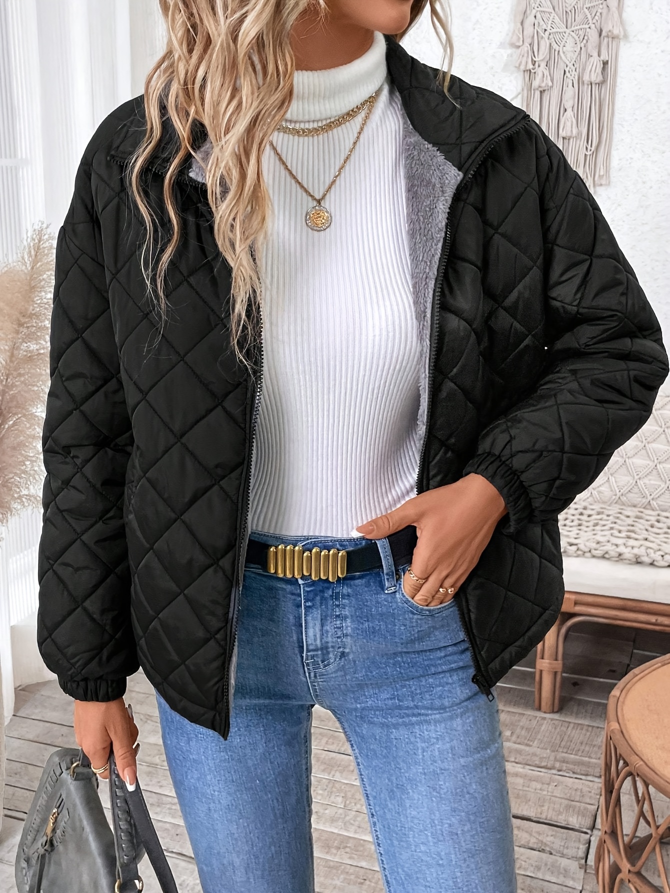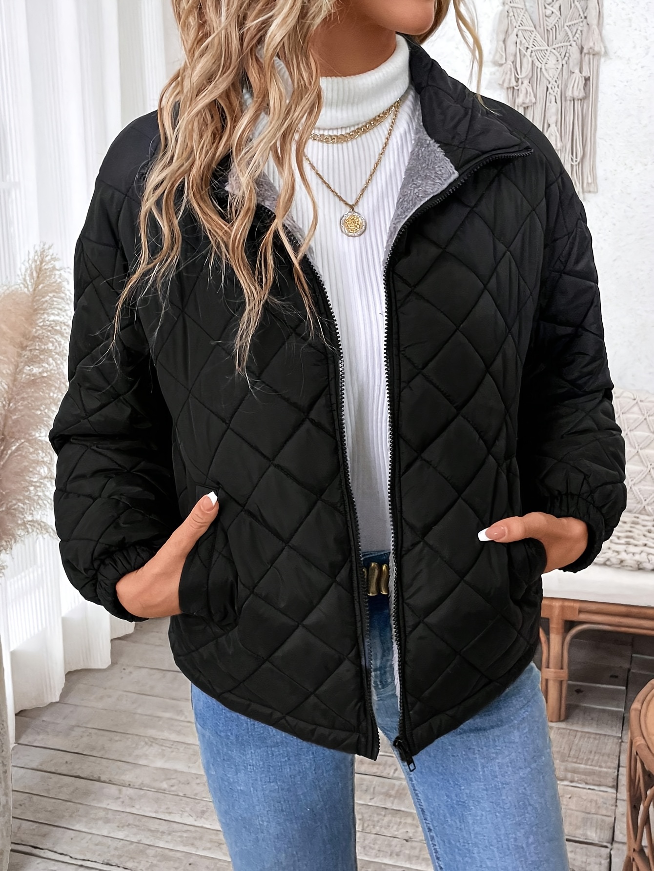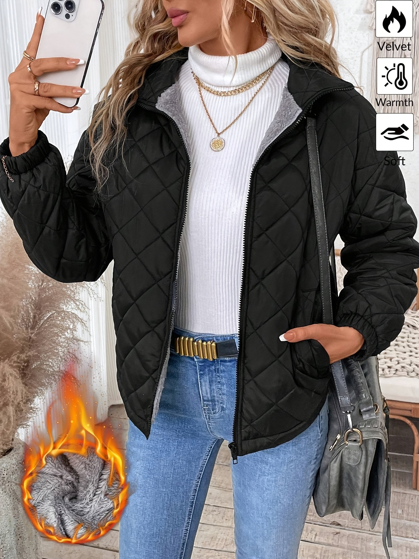 Uncategorized, WomenWomen’S Elegant Warm Fleece-Lined Quilted Jacket – Soft, Velvet-Like, Long Sleeve, Solid Color, Regular Fit, Zip-Up, Ideal for Fall & Winter, Casual Style, Casual Winter Wear | Elegant Casual Jacket | Soft Fleece Lining