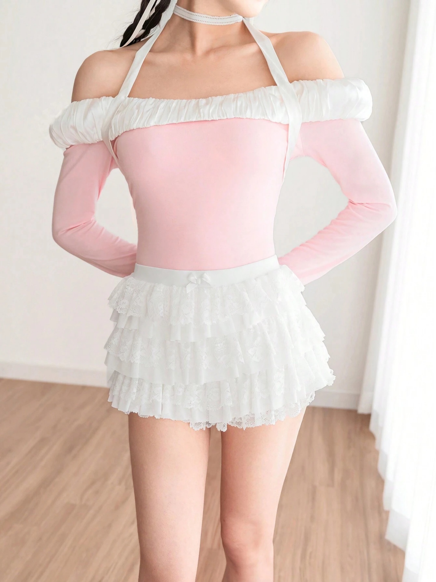 Women’s High-Waisted Solid Color Lace Trim Multi-Layer Shorts – Stretchy All-Season Casual Shorts with Ruffled Hem, Machine Washable & Dry Cleanable, White & Pastel Pink for, Casual Attire, Skirt-like Outfits