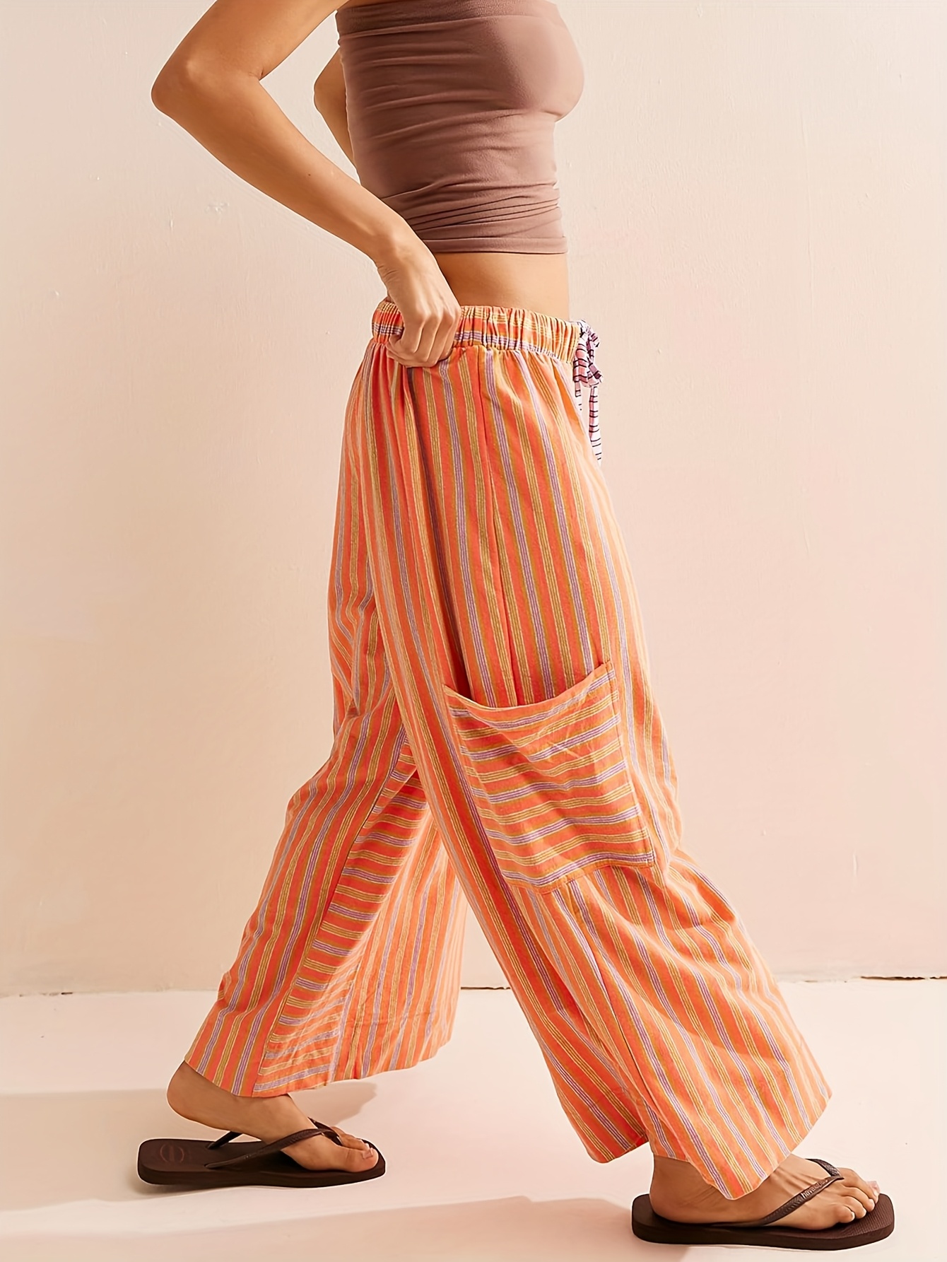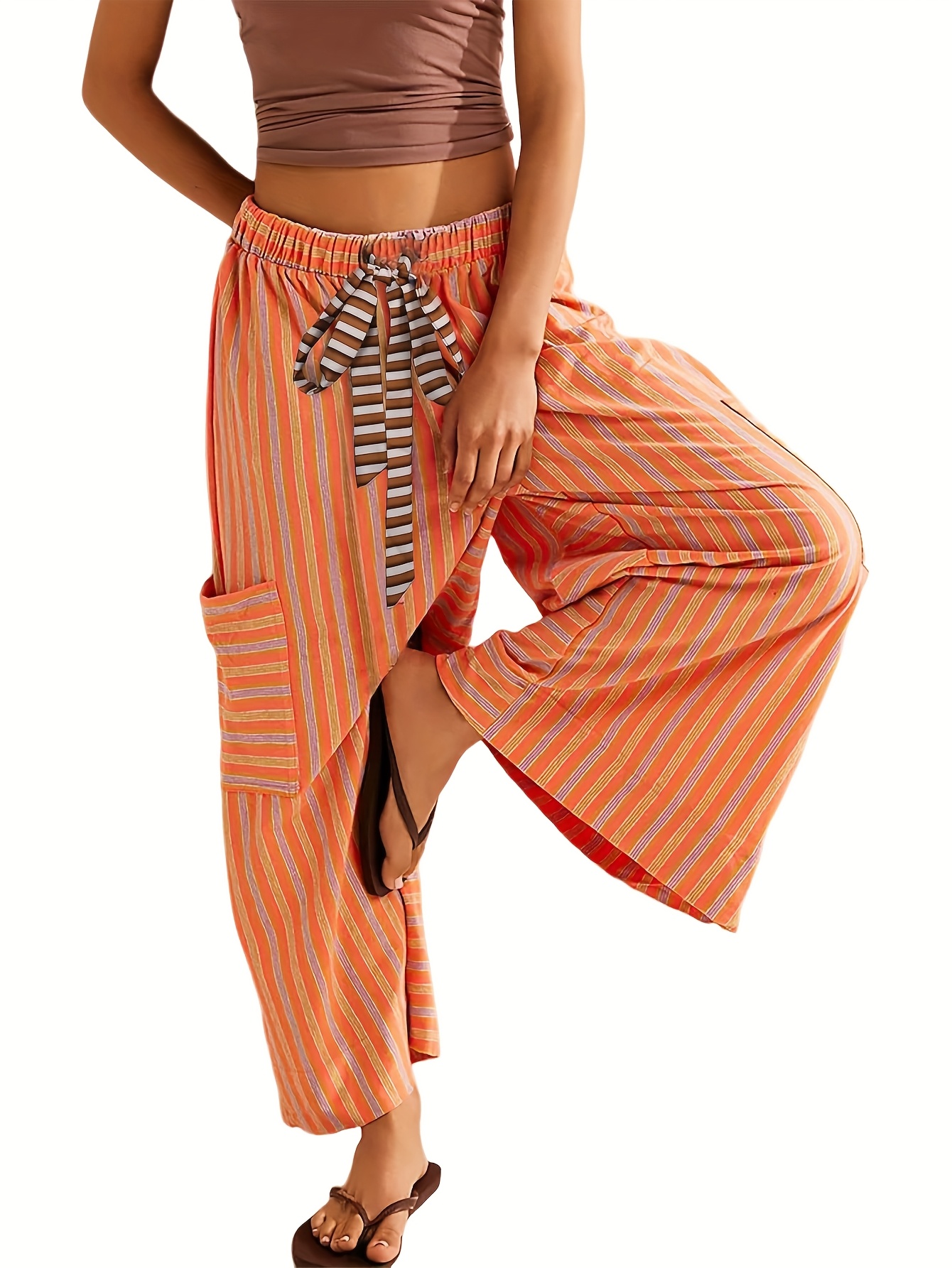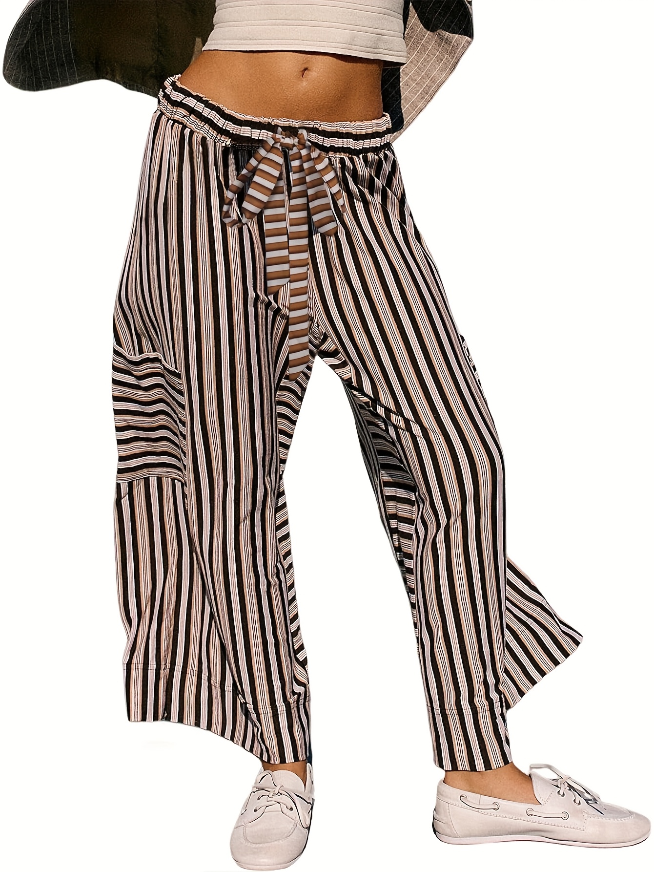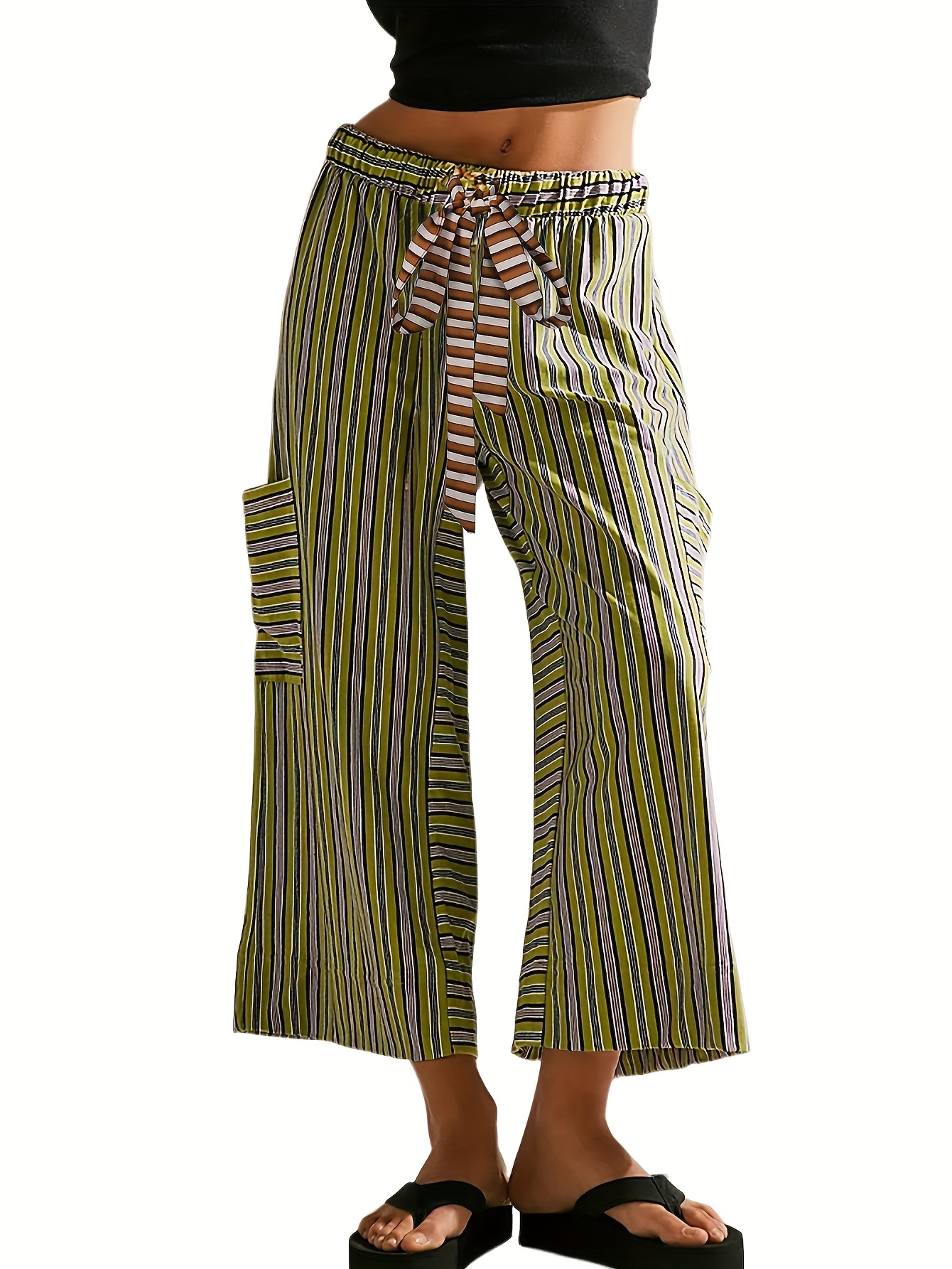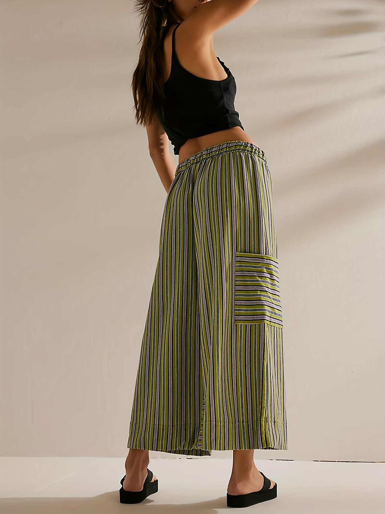 Women’s Lightweight Loose Wide Leg Palazzo Pants – Casual Elastic Drawstring Waist with Dropped Pockets, Green & White Striped 100% Polyester Trousers for Springu002FSummer Outings, Spring Attire, Fashionforward Look, Comfortable Fit