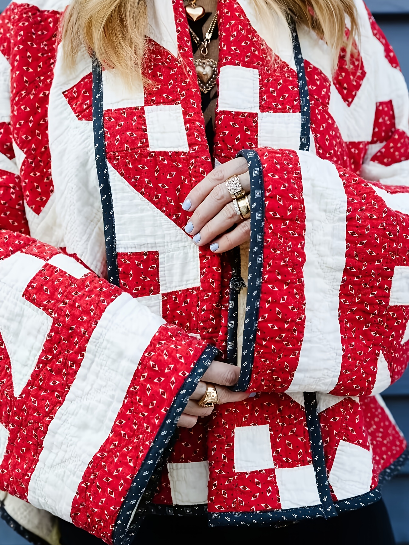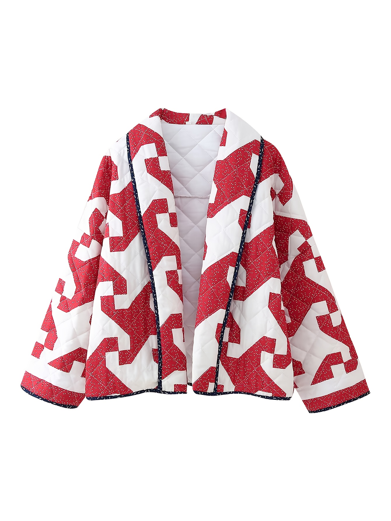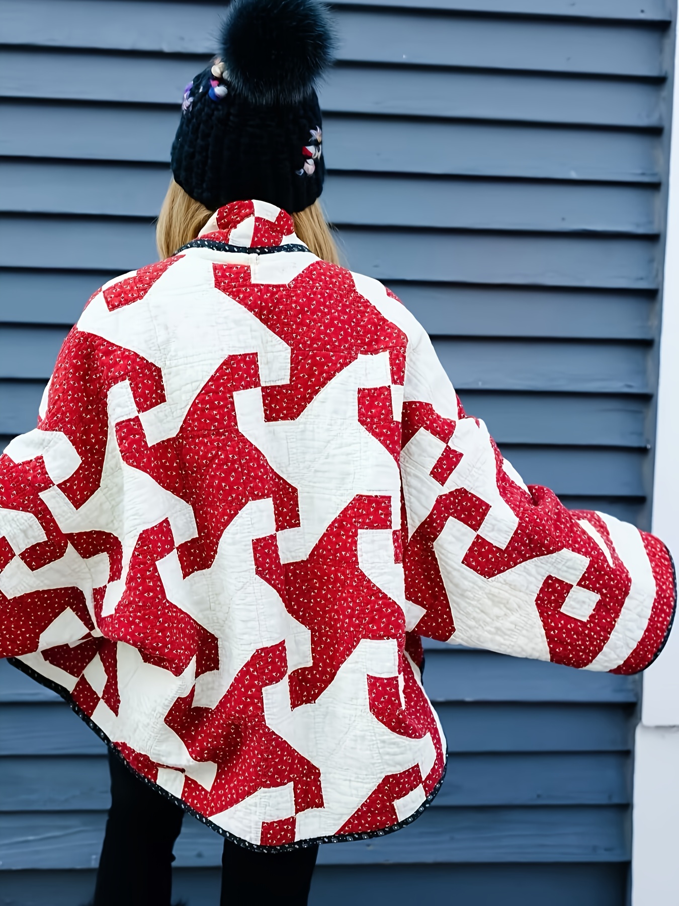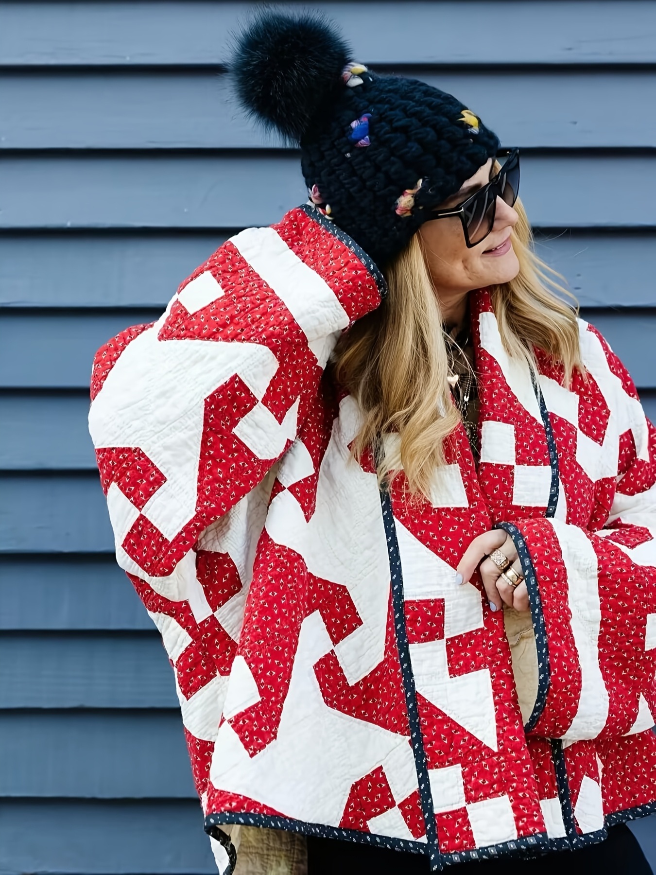 Women’S Stylish Red & White Floral Print Quilted Jacket – Loose Fit Long Sleeve Coat with Puffy Shoulders, Black Trim, and Black Beanie Hat, Perfect for Fall Fashion, Autumn Outerwear | Puffy Shoulder Design | Quilted Texture